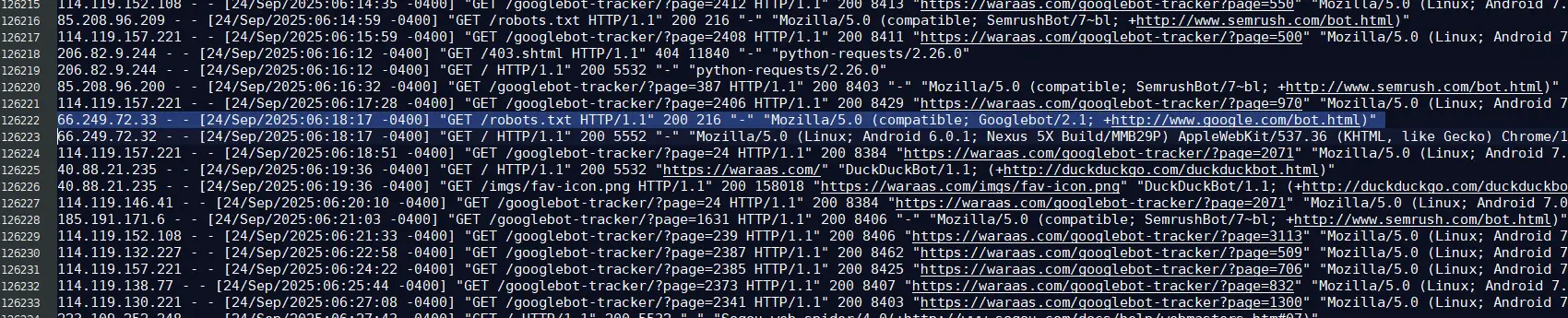 Since the host isn't Waraas.com, my tracker labels it as external crawl data. That's why these rows show up in the logs even though the domain isn't mine.
